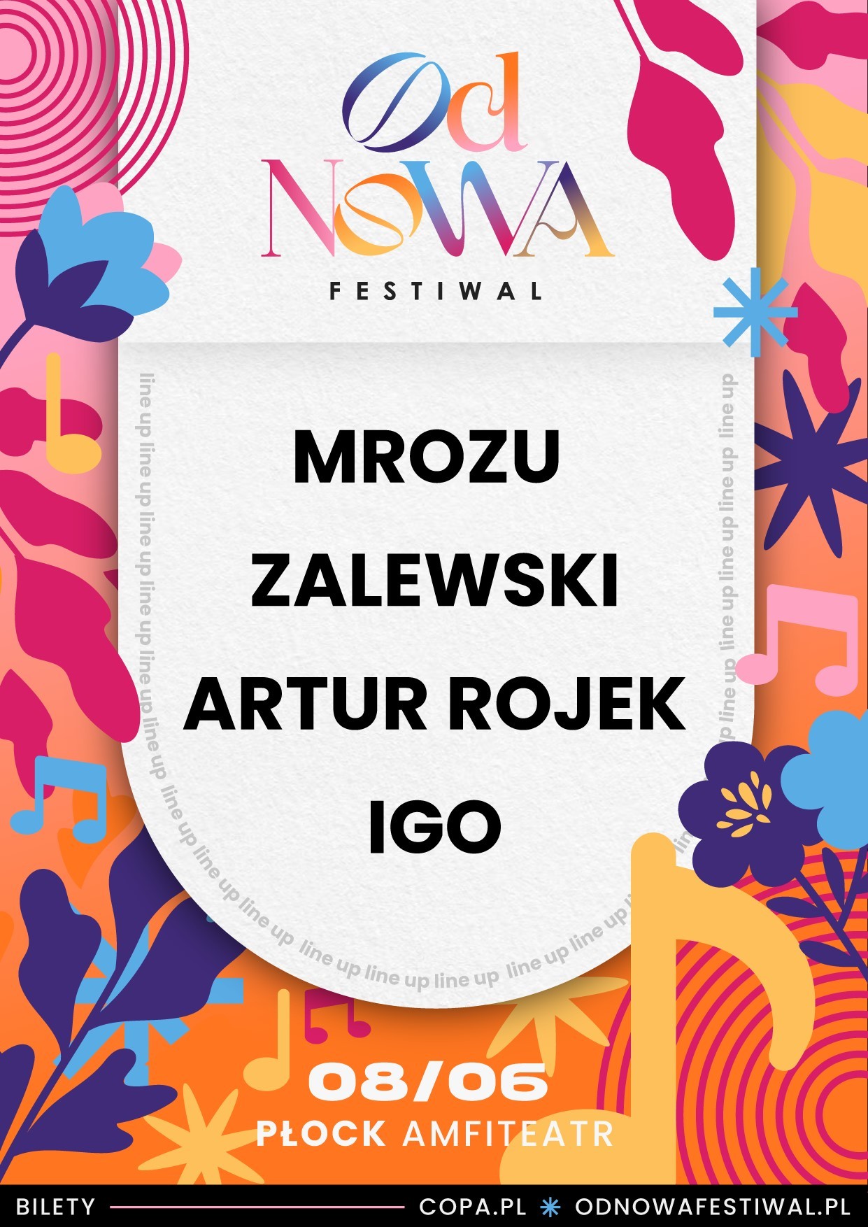🎶 Festiwal Od Nowa powraca! 🎶 8 czerwca w Płockim Amfiteatrze czeka Cię muzyczna uczta! 🔥 Mrozu, Zalewski, Artur Rojek i Igo – 4 pełnowymiarowe koncerty jednego dnia! Niesamowita energia, topowi artyści i niezapomniany klimat! 🎤✨